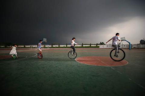 2015年4月28日,福建泉州,独轮车老师,骑着大轱辘,一个个轱辘递减,最后的一年级的小女孩骑着最小的独轮车,在老师的熏陶下,学校的孩子们爱上了独轮车运动。资料图片