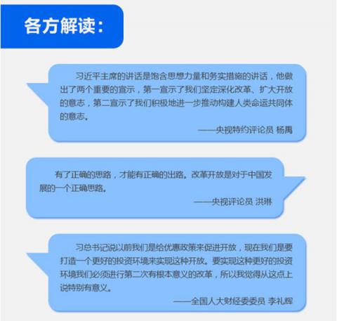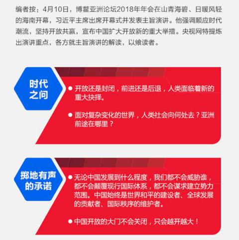 央视网消息:4月10日,博鳌亚洲论坛2018年年会在山青海碧、日暖风轻的海南开幕,习近平主席出席开幕式并发表主旨演讲。他强调顺应时代潮流,坚持开放共赢,宣布中国扩大开放新的重大举措。央视网特提炼出演讲重点,各方就主旨演讲的解读,以飨读者。