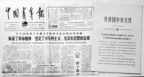 图8:报道中央团校第17期学员学习讨论真理标准问题的《中国青年报》和团中央(79)中青第36号文件