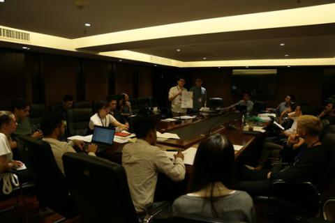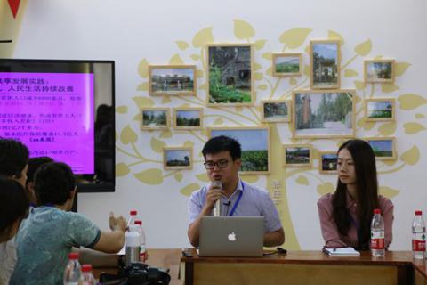 《摆脱贫困》读书分享会,林声巧(中国)和夏目英男(日本)正在代表他们的小组做读书报告,林声巧手上拿着他们小组共同制作的海报。清华大学苏心 饶金辉/摄