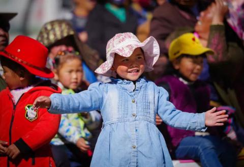 拉萨市曲水县的一名小朋友观看节目后,开心地笑了。新华社记者 刘东君 摄