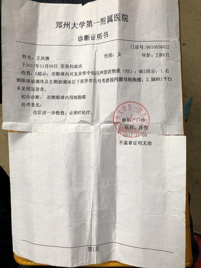 11月9日,杨美芹和爷爷带着凤雅去郑大一附院参加专家会诊。郑大一附院眼科中心主任医师陈悦向媒体回忆,会诊时大家认为肿瘤已经在眼球内,可能向颅内转移,判断其病情处于中晚期。
