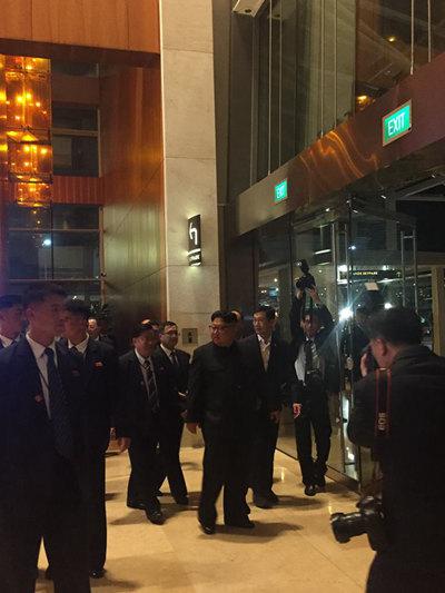 在安保人员护卫下,新加坡外交部长维文、教育部长王乙康,陪同金正恩夜游新加坡金沙酒店等处。图片来自维文推特