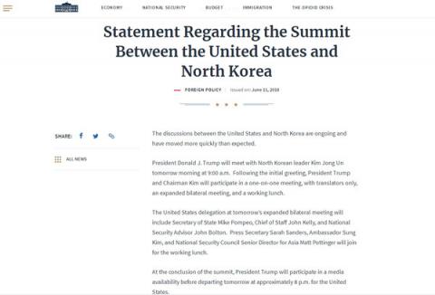 白宫声明称,美朝事先围绕“特金会”展开的各项讨论,进展得比预期要快很多。经商定,特朗普与金正恩互致问候后,两位领导人将进行“一对一”的会谈,只有翻译在场。随后举行大范围双边会议,最后双方将共进工作午餐。