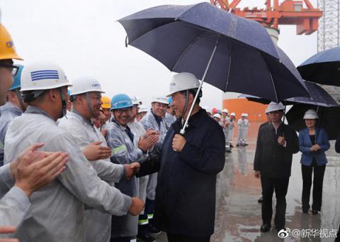 6月13日下午,习近平冒雨来到中集来福士海洋工程有限公司烟台基地。“蓝鲸1号”钻井平台巍峨伫立、“泰山”龙门吊高耸入云,习近平撑着伞边走边看,详细了解企业走自主创新发展之路、开展高端海洋工程设备自主设计研发制造情况。听说“蓝鲸1号”去年创造了可燃冰开采时间和产量两项世界纪录,习近平鼓励他们继续努力。总书记同现场的工人们一一握手,他说,基础的、核心的东西是讨不来买不来的,要靠我们自力更生、自主创新来实现。我看你们有这个信心,希望你们迎难而上、再接再厉。(记者张晓松、谢环驰)