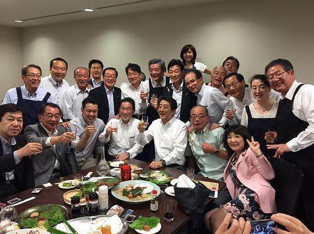 日本媒体曝出,在暴雨危险程度加剧的5日晚间,安倍晋三首相与自民党议员等约50人举行宴会,频频举杯把酒言欢,还在社交网站上发布了聚会喝酒的照片。那次宴会在东京赤坂的众院议员宿舍举行,为每月一次的所谓“赤坂自民亭”聚会。将照片发布在社交网络上的“议员”、官房副长官西村康稔称,宴会宗旨是“党干部和年轻议员坦率交谈的恳亲会”。在发布的照片中,安倍手持酒杯、面带笑容,防卫相小野寺五典也一脸笑容地靠拢在安倍身边。参加宴会的还有自民党政务调查会长岸田文雄、法务相上川阳子等人。另外一张照片显示,安倍与岸田都带去了老家的特产酒:安倍老家山口县的“獭祭”酒和岸田老家广岛县的“贺茂鹤”酒。