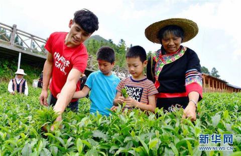 8月5日,游客在玛坑乡的生态观光茶园里体验采茶乐趣。
