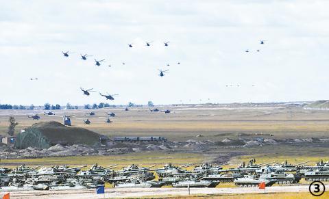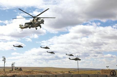 图①:9月13日,在俄罗斯楚戈尔训练场,俄方直升机群在“东方-2018”战略演习联合战役实兵演练开始后进入演习地域,开始实施机动防御。