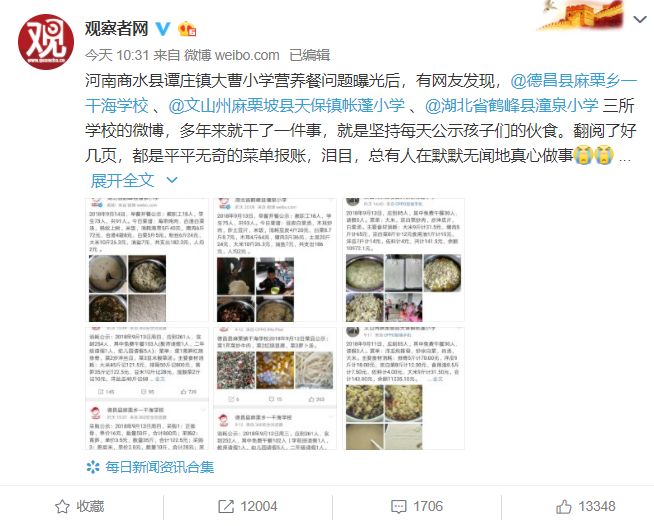 据观察者网,“三所学校的微博,多年来就干了一件事,就是坚持每天公示孩子们的伙食。翻阅了好几页,都是平平无奇的菜单报账”。