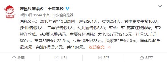 “消耗公示:2018年9月13日周四,应到261人,实到254人,其中免费午餐103人(教师请假1人,二年级请假1人,幼儿园请假5人);菜单:菜1莴笋红烧排骨,菜2炒洋丝瓜,菜3豆米酸菜汤......”