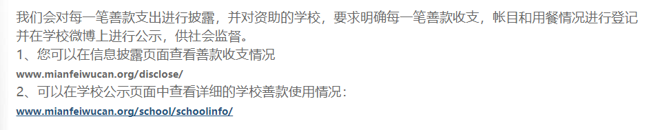 公示孩子们每日的食谱是学校使用捐款的必需流程。在免费午餐的官网我们看到,“会对每一笔善款支出进行披露,并对资助的学校,要求明确每一笔善款收支,帐目和用餐情况进行登记并在学校微博上进行公示,供社会监督。”