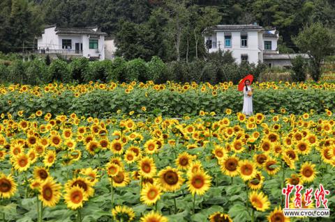 蜀源,不仅有大美天成的山水风光、星罗棋布的徽州古村落,充满徽州风情的特色民宿,成片的向日葵花海也备受旅游爱好者青睐。