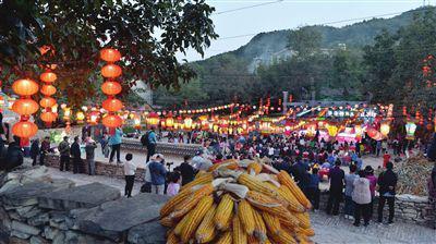 红彤彤的苹果,金黄色的柿子,新鲜的核桃、板栗……广场西侧摆放的20多种优质农产品,展示着丰收的景象;广场上方悬挂着的100多盏红灯笼,使整个村子都充满了喜庆祥和;由村民们自编自演的节目正在上演,充满乡土气息的节目表达着丰收了的农民心中的喜悦……