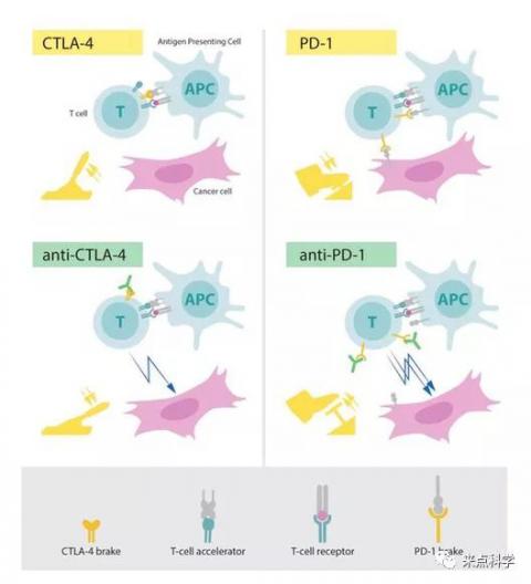 (CTLA-4、PD-1对T细胞起“刹车”作用,并攻击癌细胞。图片来自诺奖官网。)