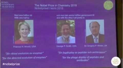 中青在线北京10月3日电(中国青年报·中青在线见习记者魏其濛)北京时间10月3日17时50分许,2018年诺贝尔化学奖揭晓,美国生物化学家弗朗西斯·阿诺德(女)、美国科学家乔治·P·史密斯、英国生物化学家格雷戈里·保罗·温特爵士获奖。弗朗西斯·阿诺德凭借“酶类定向进化”方面的贡献获得一半奖金,另两位得奖者凭借“肽和抗体的噬菌体表现 ”贡献平分剩余的一半。